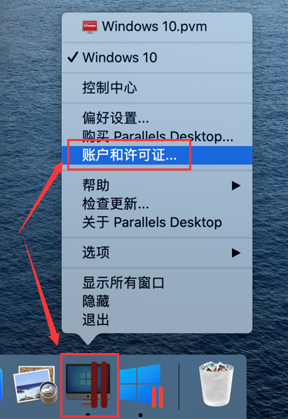 2-在mac桌面下方的程序坞栏目上,右键虚拟机的图标,点击账户和许可证选项。