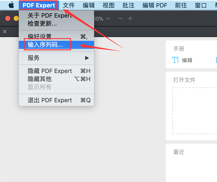 5-下载后自动打开软件界面,左上角点 PDF EXPERT 选项,选输入序列码。