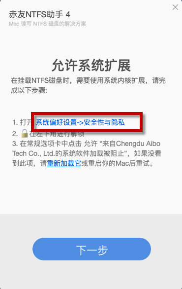 12-NTFS 驱动安装完成后,提示“系统扩展已被阻止”,需要“系统扩展”,如图: