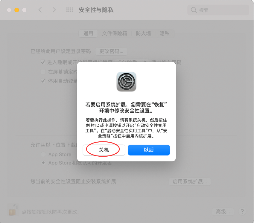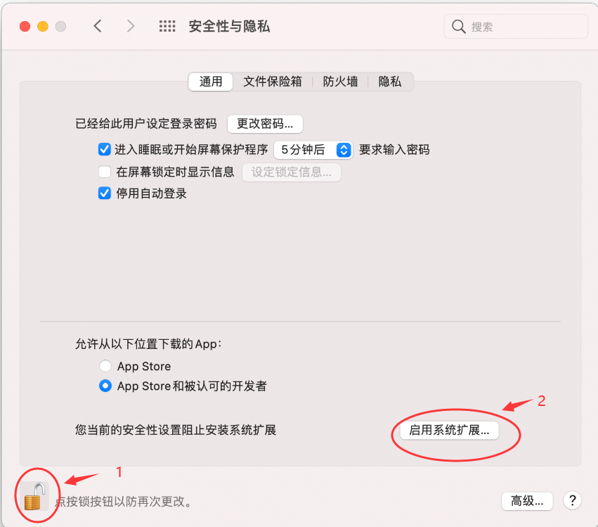13-打开安全性偏好设置 --> 安全与隐私,点击“启用系统扩展”按钮,(注意,自己电脑上没有出现下图的提示则不需要按步骤去操作了)